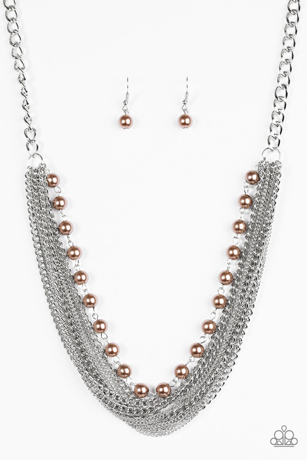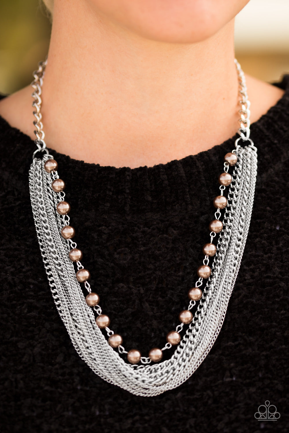 A strand of classic brown pearls gives way to layers of mismatched silver chain, creating a fierce look below the collar. Features an adjustable clasp closure.