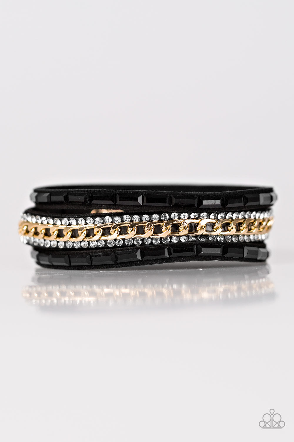 Featuring round and emerald style cuts, glittery white and black rhinestones are sprinkled along strands of black suede for a sassy look. A single strand of gold chain is laid down the center for a bold industrial finish. Features an adjustable snap closure.