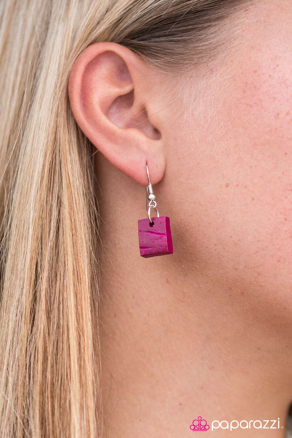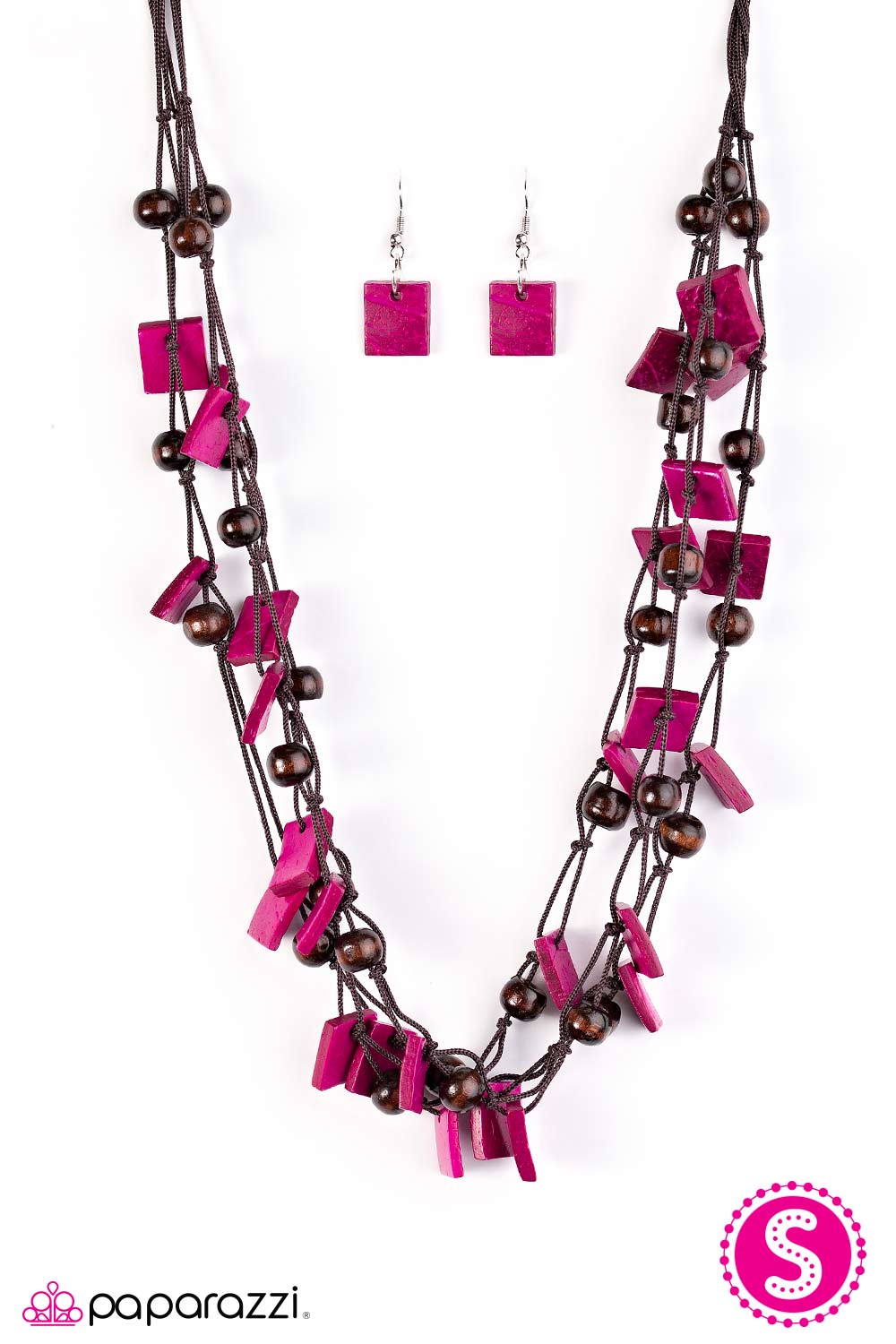 Brushed in a vivacious pink finish, bits of square wooden accents join earthy wooden beads, creating a colorfully layered look below the collar. Features a button loop closure.