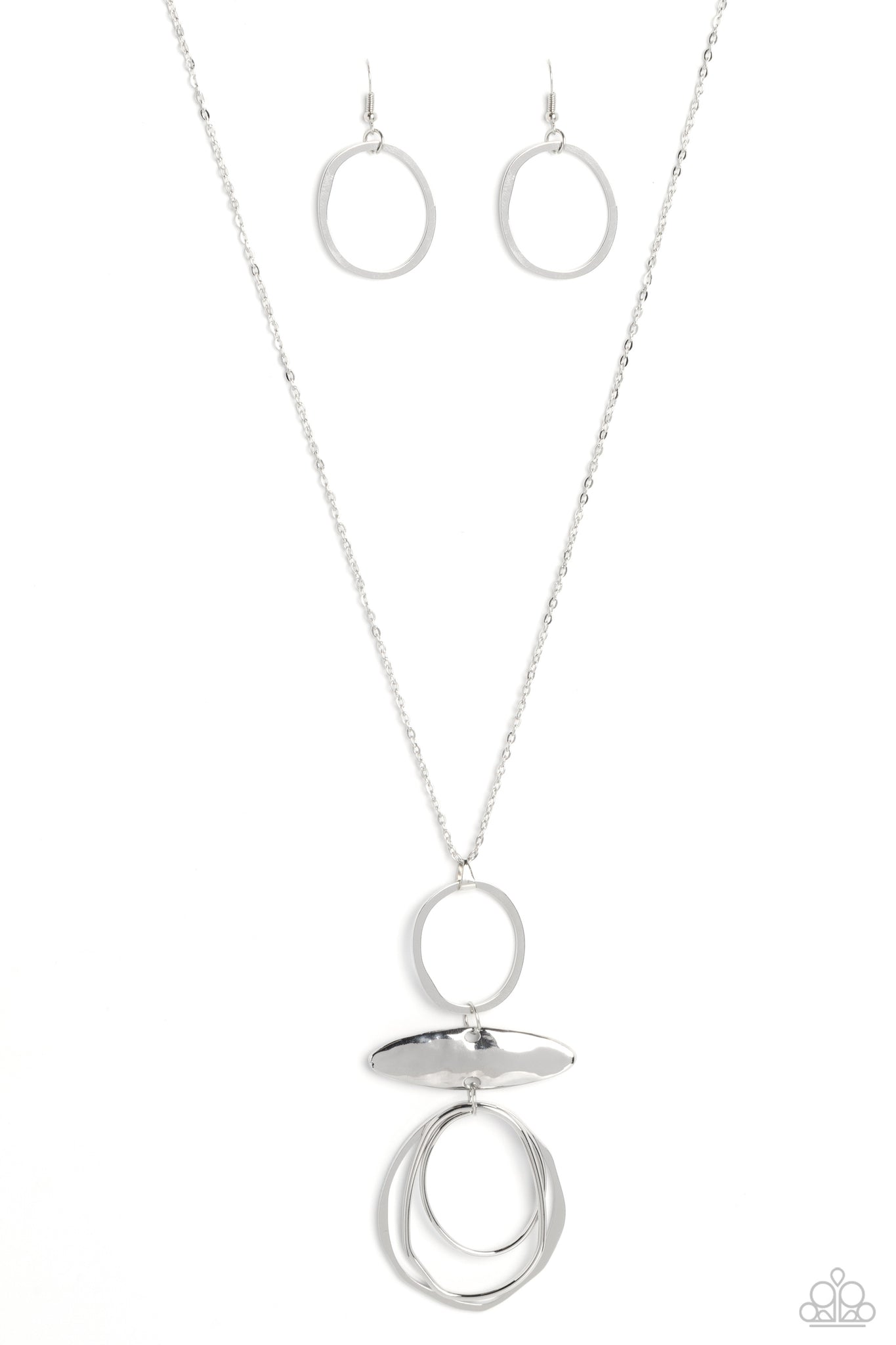 A trio of mismatched, warped, silver rings swings from the bottom of a hammered, silver oval disc tilted on its side. The oval disc then connects to another mismatched, warped silver ring that connects to an elongated chain in the same hue. Each of the monochromatic elements seemingly float atop one another creating an asymmetrically stacked pendant. Features an adjustable clasp closure.